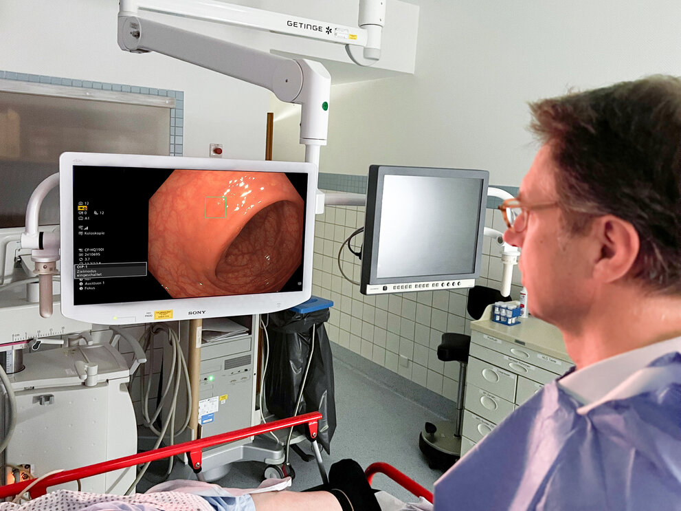 „Bei der Koloskopie wird die KI, die im Grunde nichts anderes als ein Prozessor ist, der an unser System angeschlossen wird, beim Absuchen der Schleimhaut eingeschaltet. Auf dem Bildschirm werden dann die Stellen, die potenzielle Polypen sein könnten, angezeigt, indem sie mit grünen Quadraten umrandet werden. Wenn sich nach eingehender Untersuchung herausstellt, dass es sich hierbei tatsächlich um Polypen handelt, werden diese direkt abgetragen“, beschreibt Prof. Dr. Kubitz die Vorgehensweise.