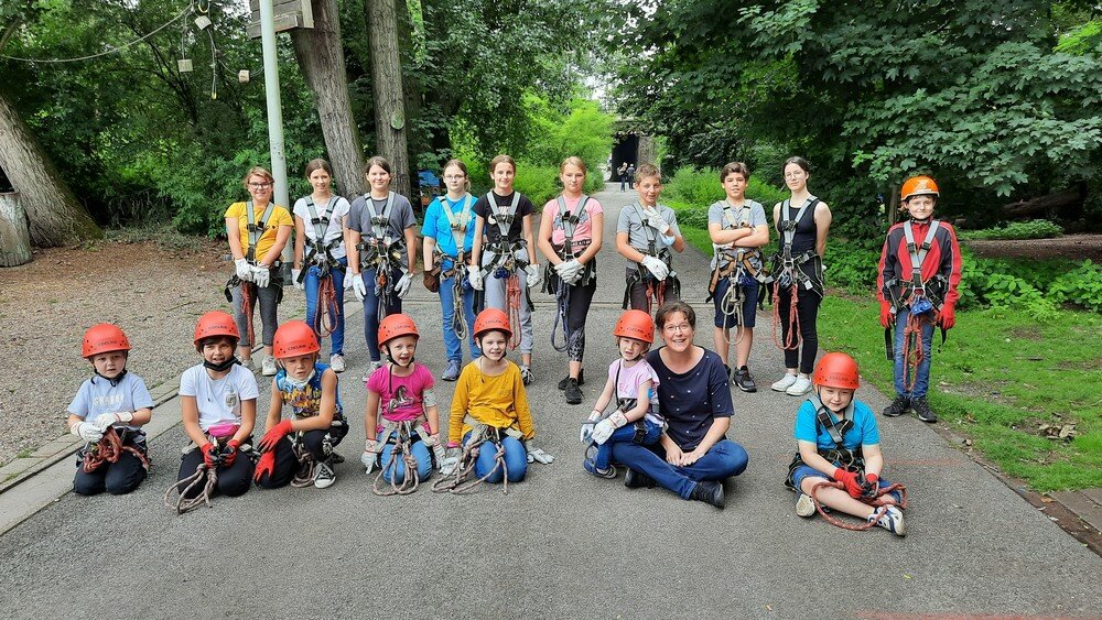 Pressefoto: Bestens ausgerüstet und hochmotiviert nahmen 17 Kinder und Jugendliche am Ausflug in den Kletterwald in Oberhausen mit Bethanien-Kinderdiabetologin Andrea Finke teil.