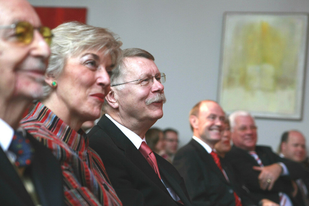 Pressefoto: Am Samstag (7.2.) verabschiedete das Krankenhaus Betanien den langjährigen Chefarzt Dr. Eckart Cillis (Mitte). Bei der Feierstunde an der Seite des scheidenden Chirurgen waren Cillis’ Ehefrau Evelyn (2.v.l.) und der knapp 90jährige Prof. Dr. Valentin Jagdschian (ganz links halb im Bild), der den jungen Mediziner Cillis in den siebziger Jahren an den Krankenanstalten Bielefeld-Mitte ausgebildet hatte. Karl-Heinz Tenter und Wilhelm Brunswick (rechts neben Cillis) dankten dem Mediziner im Namen der Bethanien-Stiftung.