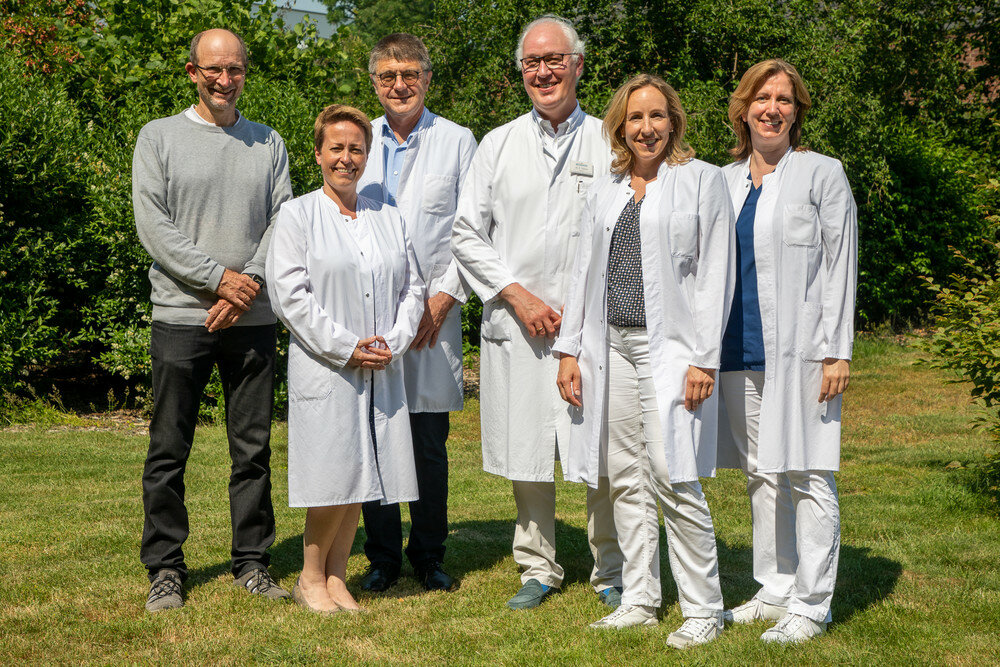 Foto: Die Partnerinnen und Partner des Kooperativen Brustzentrums Linker Niederrhein (v. l. n. r.): Prof. Dr. Volker Runde, Ärztlicher Direktor des Katholischen Karl-Leisner-Klinikums, Leitende Oberärztin der Frauenklinik am St.-Antonius-Hospital Kleve Dr. Katrin van Heumen, Chefarzt und Brustzentrumsleiter am Standort Kleve Dr. Lubos Trnka, Chefarzt der Frauenklinik am Krankenhaus Bethanien und Brustzentrumsleiter am Moerser Standort Dr. Peter Tönnies sowie die Leitenden Oberärztinnen der Frauenklinik Bethanien Dr. Almut Raabe und Dr. Dorit Brunotte.