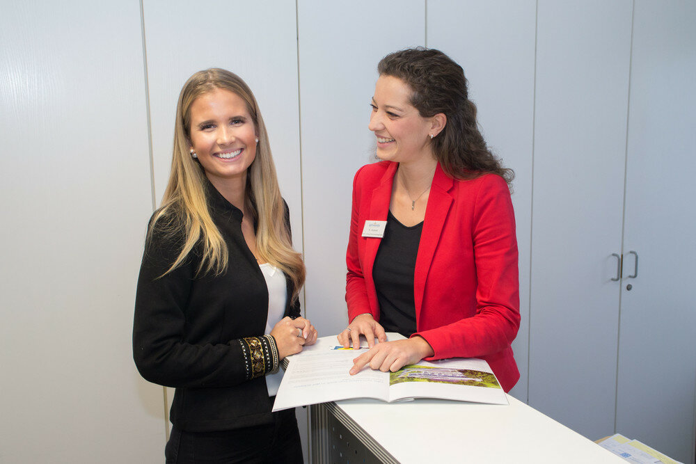 Pressefoto: Nadine Kunnen (re. in rot) kümmert sich in Bethanien um die Auszubildenden in der Verwaltung – unter anderem um Lara Bergmann.