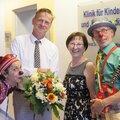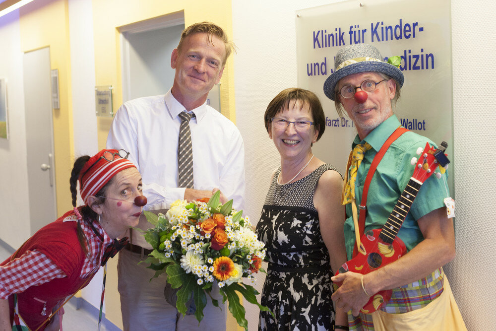 Pressefoto: Abschied mit einem lachenden und einem weinenden Auge: Bethanien-Vorstand Dr. Ralf Engels (2.v.l.) verabschiedete Rosemarie Utz (2.v.r.) nach 45 Jahren Tätigkeit in Bethanien mit einem großem Dank, guten Wünschen und einem Blumenstrauß in den Ruhestand. Die Klinikclowns Iris Held (l.) alias Stift und Holger Voss (r.) alias Schlatge brachten der angehenden Pensionärin ein spontanes Ständchen.