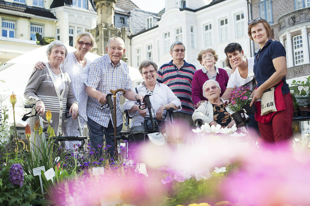 Pressefoto: Blumeneinkauf auf einem der schönsten Wochenmärkte Nordrhein-Westfalens: Die Bewohnerinnen und Bewohner Auguste Baumers (li.), Gerhard Hadamitzky (3.v.l.), Brigitte Vinnbruck (4.v.l.), Helene Klein (3.v.r.) und Lieselotte Hoeffken (sitzend) aus dem Seniorenstift Bethanien besuchten in Begleitung der ehrenamtlichen Mitarbeiterin Waltraud Wollschläger (2.v.l.) sowie dem ehrenamtlichen Helfer Klaus Klang (4.v.r.) und Pfleger Jim Ayag (2.v.r.) auf dem Moerser Wochenmarkt unter anderem den Blumenstand "Prehmium Floristik" von Giesela Prehm (ganz rechts) - und waren sichtbar begeistert von der bunten Pracht.