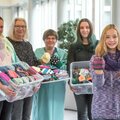 Pressefoto: Für die Frühgeborenen in Bethanien: Kinderkrankenschwester Petra Hübbers (Mitte im grünen Kittel) von der Frühchen-Intensivstation freut sich über mehr als 500 selbstgestrickte Babymützchen für die ganz kleinen Patienten. Ein Jahr lang gestrickt haben Initiatorin Jenna Zakrzewski (ganz rechts mit Kiste), Tochter Sheyla (2.v.r., im lila Pullover) und Mutter Veronika (2.v.l.) sowie Lena Eickholt (li.)