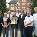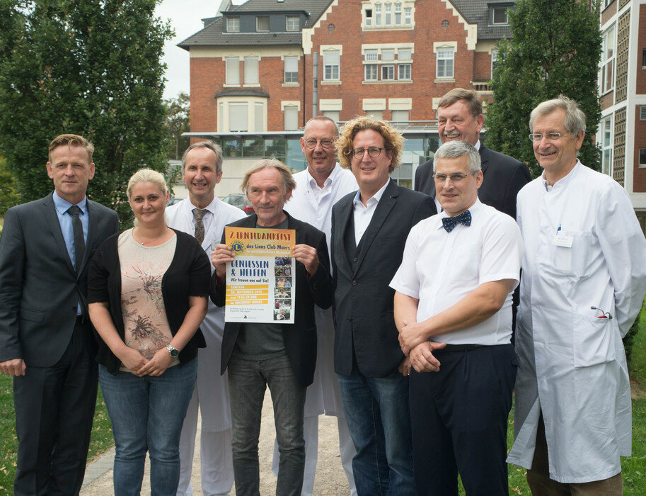 Pressefoto: Kooperation zugunsten kriegsversehrter Kinder (v.l.n.r.:) Dr. Ralf Engels, Vorstand der Stiftung Krankenhaus Bethanien, Annika Schmitz, Mitarbeiterin des Friedensdorfs International Oberhausen, Dr. Christoph Chylarecki, Chefarzt der Fachklinik für Orthopädie und Unfallchirurgie Bethanien, Wolfgang Mertens, stellv. Leiter des Friedensdorfs International Oberhausen, Dr. Thomas Voshaar, Ärztlicher Direktor des Krankenhauses Bethanien, Philipp Schneider, Activity-Beauftragter des Lions Club Moers, Prof. Dr. Robert Hierner, Plastischer Chirurg im Krankenhaus Bethanien, Dr. Reimund Göbel, Präsident des Lions Club Moers, Dr. Michael Wallot, Chefarzt der Klinik für Kinder- und Jugendmedizin Bethanien.