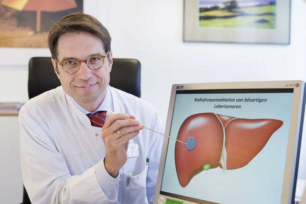 Der Mediziner bringt viel Erfahrung auf dem Gebiet mit. Mehrere hundert Patientinnen und Patienten hatte Prof. Dr. Kubitz bereits in der Uniklinik mit der Radiofrequenzablation erfolgreich behandelt, in Bethanien hat er den Eingriff ebenfalls schon bei einigen Patienten durchgeführt. Bei der kleinen Operation unter Vollnarkose führt der Mediziner die dünne Sonde über einen nur wenige Millimeter großen Zugang durch die Bauchdecke an das Tumorgewebe in der Leber heran. Mit Ultraschall überwacht der Gastroenterologe auf einem Monitor die Navigation der Sonde im Bauch der Patientin oder des Patienten. Wenn die Sonde den Tumor erreicht hat, dreht der Operateur an seinem Sondengriff. An der Nadelspitze fahren dann zwölf feine Drähte aus, über die ein hochfrequenter Wechselstrom die Elektronen im Tumorgewebe in "Schwingungen" versetzt, wodurch das Tumorgewebe um die Sondenspitze herum erhitzt wird „Ab 60 Grad Celsius 'verkocht' das von der Sonde punktierte Tumorgewebe buchstäblich, sodass der Tumor abstirbt", berichtet Prof. Kubitz.