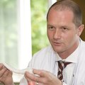 Pressefoto: Ab jetzt Professor: Bethanien-Chefarzt Dr. Bruno Geier demonstriert mit einem künstlichen Gefäßimplantat in den Händen eine seiner Operationsmethoden.