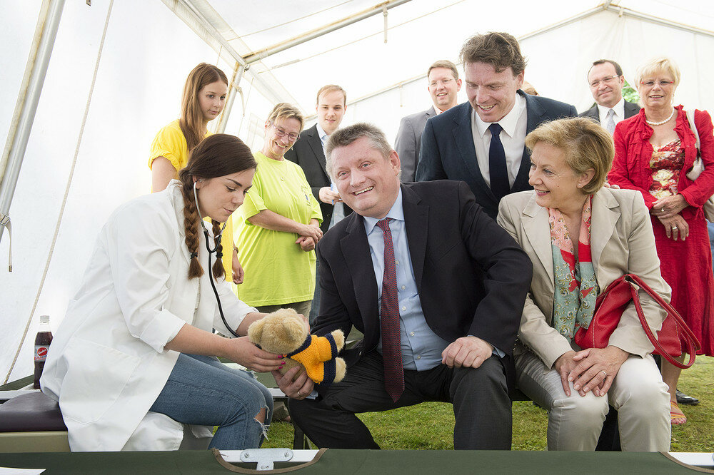 Erste Station auf Gröhes Bethanien-Visite war das Teddy-Krankenhaus im Park hinter der Kinderklinik. Mit dem Chefarzt der Kinderklinik, Dr. Michael Wallot, besichtigte der Bundesgesundheitsminister die jedes Jahr mit den Kooperationspartnern von der AOK, DRK und Freiwilliger Feuerwehr eigens für die Veranstaltung aufgebaute Zeltstadt. Im Ambulanz-Zelt begrüßte Gröhe die für ambulante Stofftierbehandlungen zuständigen Schülerinnen und Schüler der Krankenpflegeschule Bethanien. „Gleich kommt ein Teddy mit gebrochenem Arm“, kündigte Gröhe den nächsten plüschigen Patienten an. „Dieser Teddy ist von Bethanien, der ist bestimmt gesund“, sagte Gröhe und hielt dabei einen Teddy in orange-farbenem Pullover mit der Aufschrift Bethanien hoch. Zur Vorsicht ließ der Minister den Bethanien-Teddy trotzdem von Krankenpflegschülerin Tamara Tobias auf gesunde Herztöne abhören – sicher ist sicher.