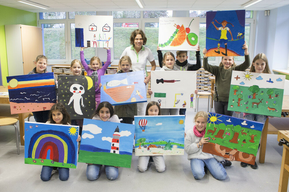 Pressefoto: Malten für die neue Kinderarztpraxis: Kinder der Eschenburg-Grundschule in Moers-Asberg schenkten der neuen Kinderärztin in der Nachbarschaft bunte Bilder für die Praxisräume. Dr. Henriette Kyrieleis (hinten stehend) kam persönlich zu einem Besuch in die Schule, um die Gemälde in Empfang zu nehmen.