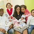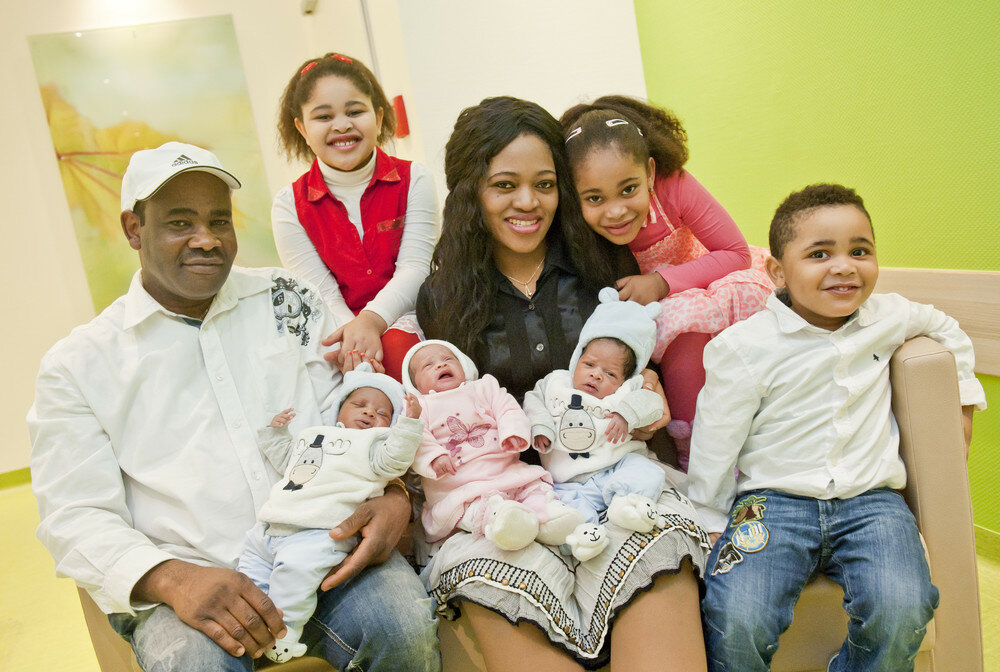 Pressefoto: Familie Nmeka wäre dann jetzt komplett: Am Freitag (30.10.) wurden die Drillinge (v.l.n.r.) William, Vivian und Walter von der Frühchen-Intensivstation des Moerser Bethanien-Krankenhauses entlassen. Ab jetzt sind sie bei Papa Churchill und Mutter Henriatta sowie den älteren Geschwistern Swenna (hinten links), Melissa und Bruder Chris-Churchill in Duisburg-Stadtmitte zu Hause.