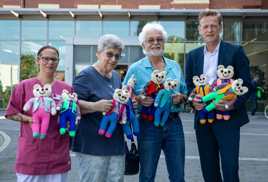 Zur Spendenübergabe kam die handarbeitserprobte Rentnerin gemeinsam mit ihrem Mann Manfred Radermacher und übergab die farbenfrohen Stoffpuppen an den Vorstand der Stiftung Bethanien Dr. Ralf Engels und an Sarah Dettki, Stationssekretärin der Klinik für Kinder- & Jugendmedizin. „Ich möchte mich im Namen der Kinderklinik herzlich beim Ehepaar Radermacher für seinen Einsatz und die liebevoll gehäkelten Schmusis bedanken. Die Puppen kommen gut bei unseren kleinen Patientinnen und Patienten an und spenden ihnen Trost, während sie bei uns sind“, betont Dr. Engels.