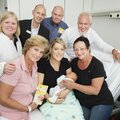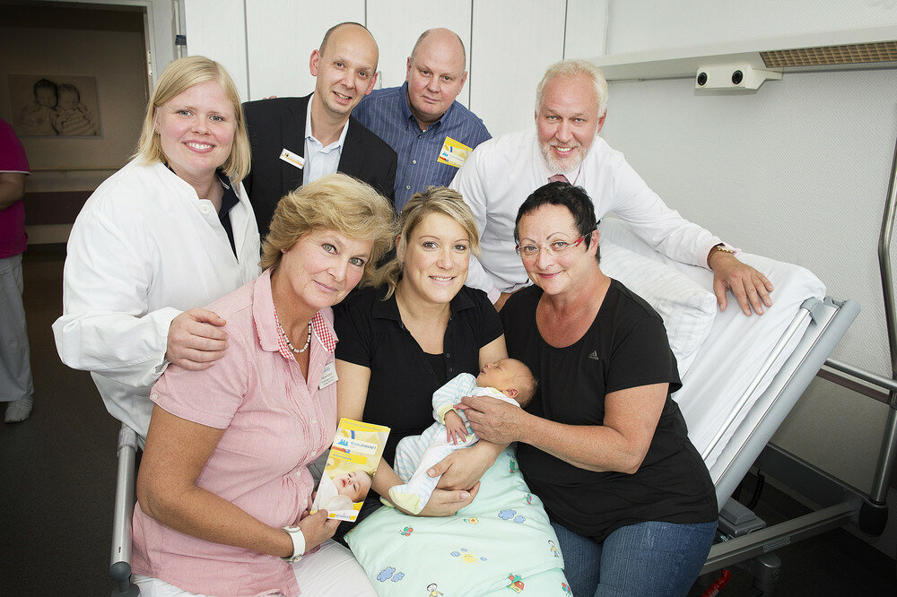 Pressefoto: Gemeinsam für das Wohl von Mutter und Kind (hinten v.l.n.r.): Dr. Miriam Saxe, Oberärztin in der Frauenklinik St. Josef, Stephan Caniels, Zentrale Koordination „Frühe Hilfen“ im Jugendamt Moers, Ingolf Rascher vom wissenschaftlich begleitenden Institut zur Modernisierung von Wirtschafts- und Beschäftigungsstrukturen (IMO) in Hilden und Chefarzt Dr. Peter Tönnies von der Bethanien-Frauenklinik sowie Kinderkrankenschwester Sabine Kühnel (vorn li.) als Koordinatorin von KinderZUKUNFT NRW in der Elternschule Bethanien sowie Krankenschwester Elisabeth Leiße (vorn re.) als Stationsleitung der Geburtshilfe im Krankenhaus St. Josef beim gemeinsamen Besuch auf der Bethanien-Wochenstation im Zimmer der jungen Mutter Lisa Köster aus Kamp-Lintfort mit Sohn Luis.