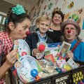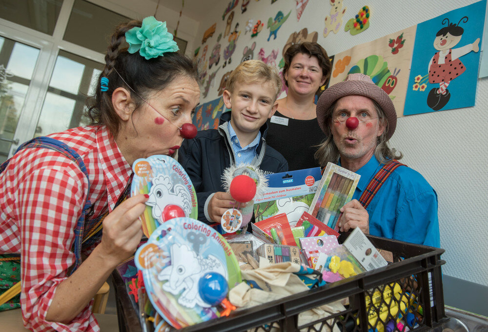 Pressefoto: Einen großen Korb bunter Bastelsachen überreichte der elfjährige Lord Lion Vincent (Mitte) an Erzieherin Sarah Beilborn (hinten) von der Kinderklinik Bethanien. Im Spiel- und Bastelzimmer der Kinderklinik erfüllte sich Lions Wunsch, die Klinikclowns Iris Held alias Stift (li.) und Holger Voss alias Schlatke (re.) kennenzulernen.