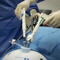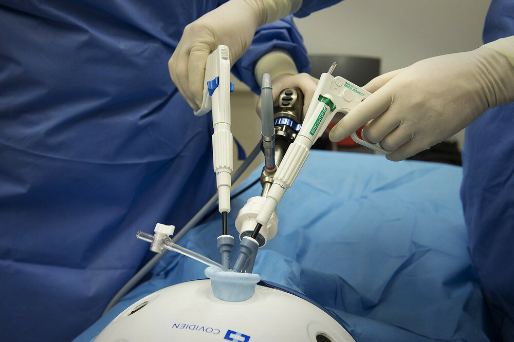 Pressefoto: Üben am Plastikpatienten: Über den blauen Gummipfropfen, die bei richtigen Patienten in den Bauchnabel gesetzt werden, schieben die Chirurgen alle Operationsinstrumente in den Bauch. Nach der Operation gibt es keine Narben, der Bauchnabel wächst wieder zu.