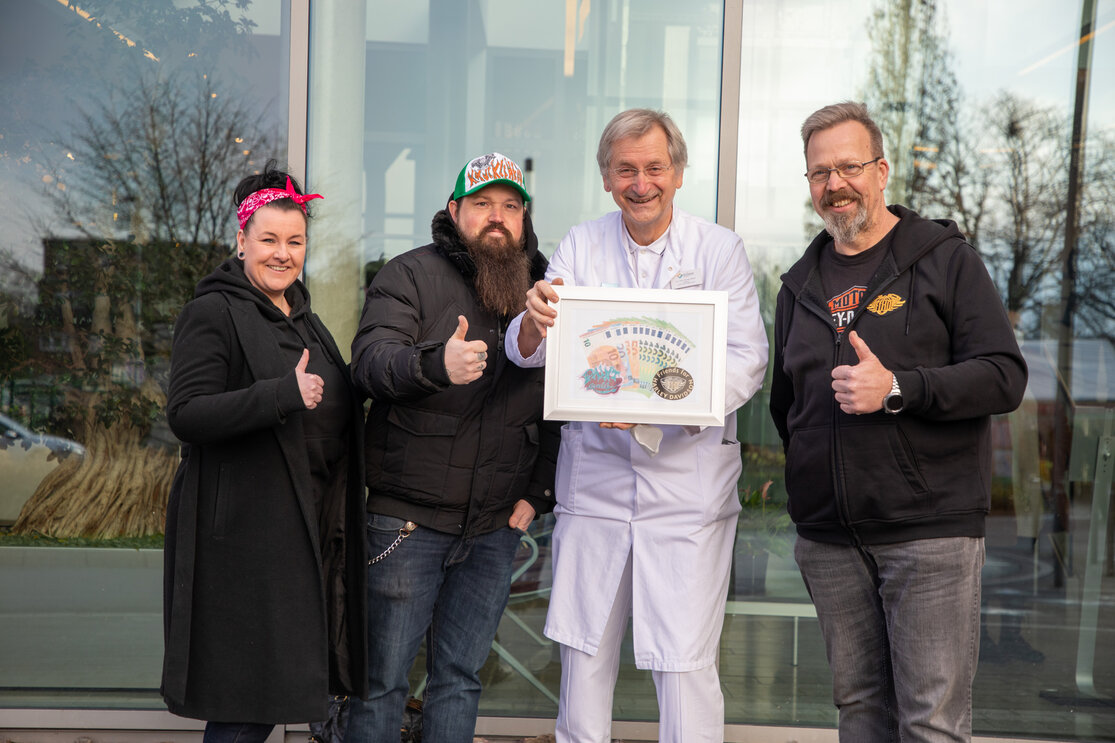 Auf Facebook wurden der Administrator der Facebookgruppe Uwe Ferrai und die beiden Künstler Nena Kaiser und Flo Glacer aufeinander aufmerksam. Aus einer zersägten Motorhaube fertigten die Künstler von Paint gambler das Logo der Harley-Gruppe und versteigerten es anschließend gemeinsam für den guten Zweck. Mit der Bietergebühr, dem Erlös der Versteigerung, Erlöse aus einem früheren Fahrertraining der Harley-Gruppe sowie weiteren Spenden konnte schließlich die vierstellige Spende für die Klinikclowns an den Chefarzt der Kinderklinik Dr. Michael Wallot übergeben werden. „Vielen Dank für Ihren Einsatz und die Spende. Damit werden wir die Kinderaugen weiterhin zum Strahlen bringen können“, betont Wallot.