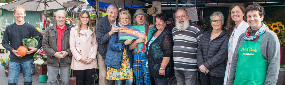 Pressefoto: Die Moerser Marktfrau Carola Wolter (Mitte mit Schild) übergab in Meerbeck eine Spende an Chefarzt Dr. Michael Wallot (4.v.l.) von der Kinderklinik, Dr. Kathrin Stepanow, Leiterin der Unternehmenskommunikation in Bethanien (3.v.l.), und Klinikclown Holger „Schaltge“ Voss (6.v.r.) vom Verein Clownsvisite. Die Aktion hatten unter anderem auch der Gemüsehändler Gregor Heyen (1.v.l.), die Obst- und Gemüsehändlerin Christel Meuskens (1.v.r.) und Christina Roth (2.v.r.) von der Meerbecker Linden-Apotheke unterstützt.