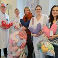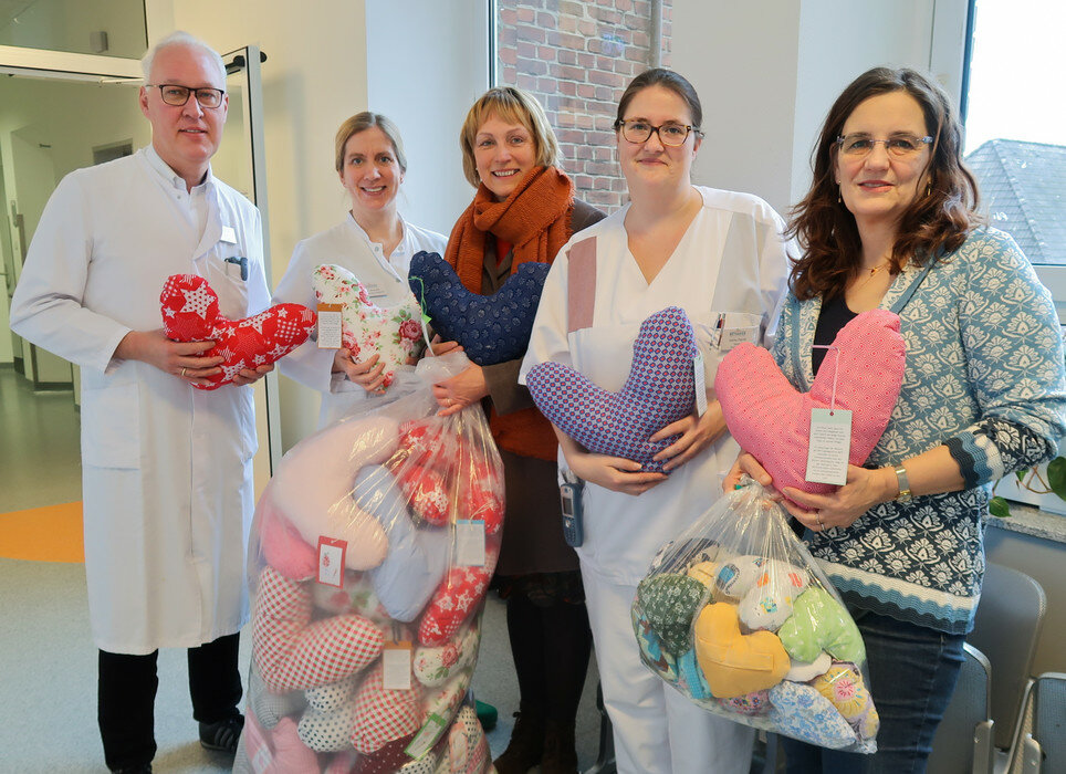 Pressefoto: 200 Herzkissen für Frauen mit Brustkrebs übergaben Angelika Matthaei (re.) und Silvia Zöllner (3. v. li.) von der Volkshochschule Kempen im Brustzentrum der Frauenklinik Bethanien an Stationsleiterin Sabine Pajonk (2.v.r.), die Leitende Oberärztin Dr. Dorit Brunotte und Chefarzt Dr. Peter Tönnies.