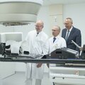 Pressefoto: Mehr als 2 Mio. Euro kostet ein Linearbeschleuniger modernster Bauart, wie er jetzt in der Praxis für Strahlentherapie Duisburg-Moers auf dem Campus Bethanien in Moers in Betrieb gegangen ist (v.l.n.r.): Die Strahlenmediziner Franz Lücker und Dr. Thomas Schwerdtfeger von der eigenständigen Praxis demonstrieren das Gerät Bethaniens Ärztlichem Direktor Dr. Thomas Voshaar. Bestens mit dem Gerät vertraut ist bereits Lothar Meyer, medizinisch-radiologischer Assistent in der Strahlenpraxis.