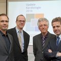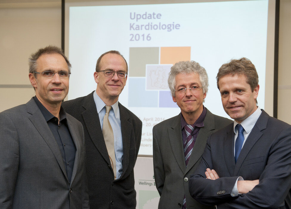 Pressefoto: Fachlicher Austausch von niedergelassenen Kardiologen und Klinikärzten: Beim "Update Kardiologie 2016" im Repelner Hotel zur Linde referierten (v.l.n.r.) Dr. Stefan Schickel vom Department für Kardiologie des Krankenhauses St. Josef, Dr. Stephan Linse und Dr. Georg Durben als niedergelassene Moerser Kardiologen und Chefarzt Prof. Dr. Stefan Möhlenkamp von der Klinik für Kardiologie des Krankenhauses Bethanien.
