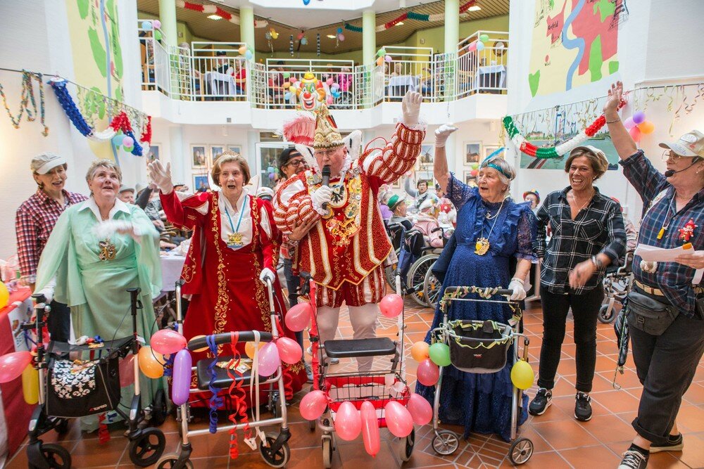 Wie das offizielle Prinzenpaar des Grafschafter Karnevals erschien das hauseigene Senioren-Prinzenpaar im festlichen Ornat und mit routiniertem Helau. Als besonderes Accessoire sorgten bunt dekorierte Rollatoren bei Prinz und Prinzessin sowie bei den Hofdamen für Halt und Standfestigkeit im närrischen Trubel. „Ich hoffe, dass Ihr alle Freude habt!“, rief Prinz Wilfried ins jubelnde Publikum. Auch Prinzessin Margarethe zeigte sich „ganz happy“ über die schöne Feier in der festlich geschmückten Cafeteria des Bethanien-Seniorenstifts, wo sich alle Gäste ebenfalls phantasievoll verkleidet hatten.