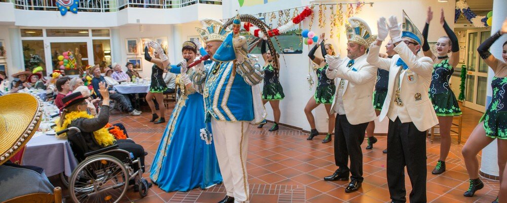 Organisiert hatte die Feier der Soziale Dienst des Seniorenstifts um Oliver Hering und Margot Kläckes, die verkleidet als Siglinde Hüpfmaus durch das Karnevalsprogramm führte. „Es ist für uns immer wieder schön zu sehen, wie die Bewohnerinnen und Bewohner zur Karnevalsfeier aufgehen. Für viele, die vom Niederrhein kommen, ist das eine wichtige Tradition. Weil den meisten die Hits, die hier gespielt werden, bekannt sind, singen sie lauthals mit. Ihre Freude springt dann natürlich auch auf uns über“, resümiert Oliver Hering, Leiter des Sozialen Dienstes.