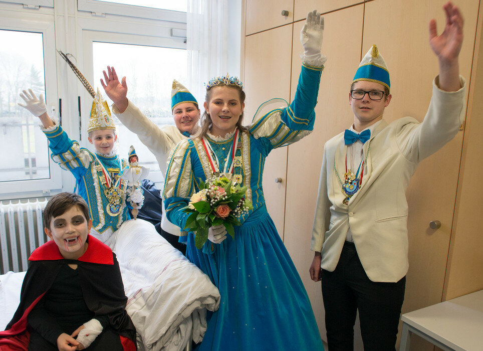 Pressefoto: Das Moerser Kinderprinzenpaar Max I. (hinten links) und Hannah I. (Mitte) mit seinen Ministern Demian Driske (hinten Mitte) und Maurice Skotarczyk (re.) besuchten in der Kinderklinik Bethanien unter anderem den Patienten Talha Akyol (li.) aus Moers, der sich als Vampir verkleidet hatte.