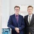 Pressefoto: Freundliche Begrüßung durch Bethanien-Stiftungsvorstand Dr. Ralf Engels (re.): Mit dem Labormediziner Dr. Thomas Becker (li.) leitet jetzt erstmals ein eigener Chefarzt das Krankenhaus-Labor.