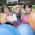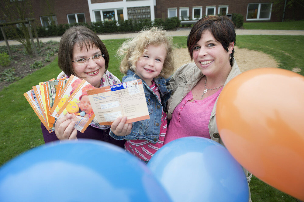 Pressefoto: Post aus Skandinavien: Bethanien-Frühchen Lana Meier (Mitte) und ihre Mama (re.) siegten beim Ballonwettbewerb, ihre Karte flog fast 2.000 Kilometer. Kinderkrankenschwester Petra Hübbers (li.) hatte den Wettbewerb zum Internationalen Tag des Frühgeboren organisiert.