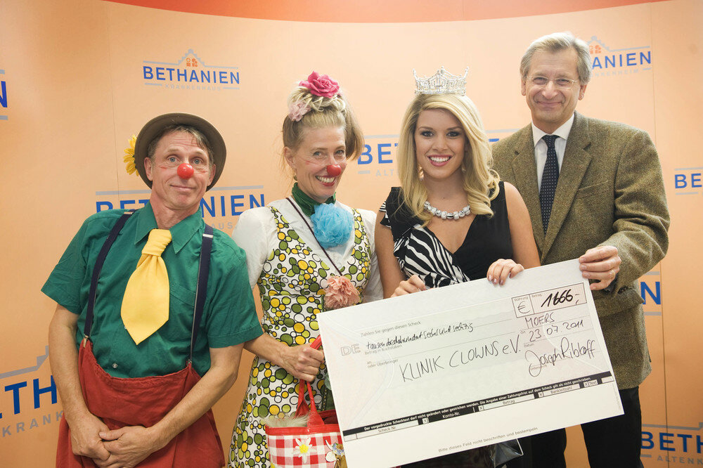 Ein besonderer Tag in der Kinderklinik Bethanien am vergangenen Samstag (23.7.): Die amtierende Miss America 2011 hatte ihren hohen Besuch angekündigt. Begleitet von Heiner Borgelt, Deutschland-Chef des kanadischen Modelabels Joseph Ribkoff und Baerbel Punessen, Marketingleiterin des Moerser Sport- und Modecenters Braun kam die 18-jährige Teresa Scanlan in die Kinderklinik, um eine große Spende in Höhe von genau 1666 Euro zu übergeben. Das kanadische Modelabel ist offizieller Designer von Miss America, das Sport- und Modecenter hatte beide für mehrere Modenschauen nach Moers geholt. "Wir wollten bei unserem Besuch im Moers nicht nur unsere Mode präsentieren, sondern auch Gutes tun", so Ribkoff-Geschäftsführer Borgelt zu den Hintergründen. Und da auch Modenschau-Gastgeber Braun seit langen zu den treuen Spendern der Kinderklinik zählt, war man sich schnell einig: Der Betrag soll den in Bethanien tätigen Klinikclowns vom Verein Clownsvisite zugute kommen.