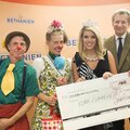 Pressefoto: Im Namen des Modelabels und offiziellen Miss America-Designers Joseph Ribkoff übergab die amtierende US-Schönheitskönigin Teresa Scanlan (2.v.r.) einen großen Spendenscheck an Chefarzt Dr. Michael Wallot (re.) von der Kinderklinik sowie an Schlatke alias Holger Voss (li.) und Flocke alias Silke Eumann (2.v.l.), die beiden Bethanien-Klinikclowns vom Verein Clownsvisite.