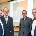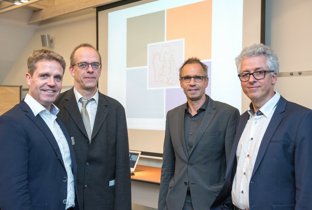 Pressefoto: Bei so viel kardiologischer Kompetenz schlagen auch die Herzen der Fachleute höher: Die beiden Moerser Chefärzte Prof. Dr. Stefan Möhlenkamp (li.) vom Krankenhaus Bethanien und Dr. Stefan Schickel (2.v.r.) vom Krankenhaus St. Josef hatten gemeinsam mit ihren niedergelassenen Kollegen Dr. Stefan Linse (2.v.l.) und Dr. Georg Durben (re.) zum "Kardio-Forum 2017" ins Hotel Zur Linde in Moers-Repelen eingeladen.