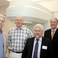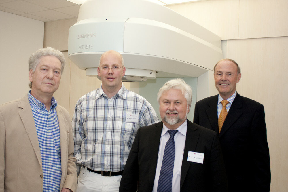 Pressefoto: Die Fachärzte Dr. Henning Konrad, Franz Lücker und Hartmut Klages von der Strahlentherapie Duisburg-Rheinhausen und Vorstandsvorsitzender des Krankenhauses Bethanien Karl-Heinz Tenter freuen sich über die Kooperation.