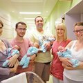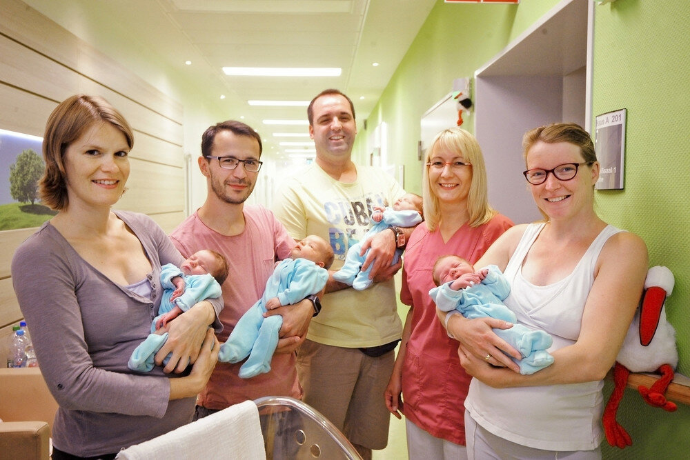 Pressefoto: Mit 130 Babys in einem Monat stellte Bethanien unter der neuen Leitenden Hebamme Ursula Kamp (2.v.r.) im Juli einen neuen Rekord bei der Geburtenzahl auf. Für das Foto präsentieren sich die Babys Nummer 127 bis 130, die alle am 31. Juli geboren wurden (v.l.n.r.): Anke Bongartz aus Krefeld mit Tochter Mara Louisa, Ado Massoeur aus Moers mit Tochter Isabella, Daniel Heinrich aus Duisburg mit Tochter Emma und Anne Brandhoff aus Kamp-Lintfort mit Sohn Theodor Justus.