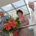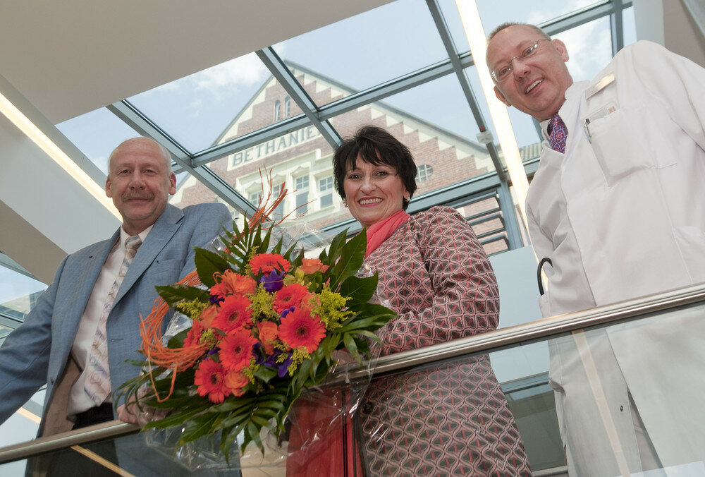 Pressefoto: Blumen für die neue Pflegedirektorin Angelika Dahlhaus überreichten Bethanien-Krankenhausdirektor Wolfgang Kupferschmidt (li.) und der Ärztliche Direktor Dr. Thomas Voshaar (re. im weißen Kittel)