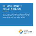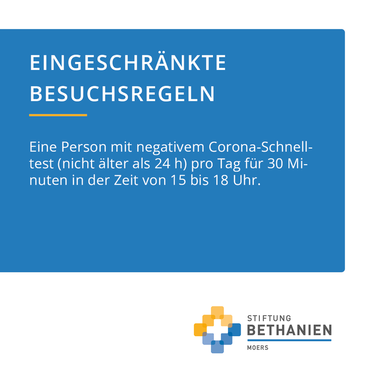 Der Bundestag hat ein neues Infektionsschutzgesetz verabschiedet. Neue Anforderungen ergeben sich daraus auch für Besuche im Krankenhaus Bethanien. Ab sofort muss jede:r Besucher:in einen negativen Corona-Test vorweisen können, unabhängig vom Impf- oder Genesenenstatus. Jede:r Patient:in darf pro Tag nur noch eine:n Besucher:in für maximal 30 Minuten empfangen. Die Besuchszeiten sind von 15 bis 18 Uhr. Vorab muss ein Anmeldebogen ausgefüllt werden. Dieser ist auf der Website des Krankenhaus Bethanien (www.bethanien-moers.de) zu finden oder kann vor Ort von den Mitarbeiter:innen ausgehändigt werden. Ab sofort gilt auch vor dem Haupteingang des Krankenhauses die Maskenpflicht.