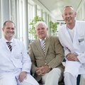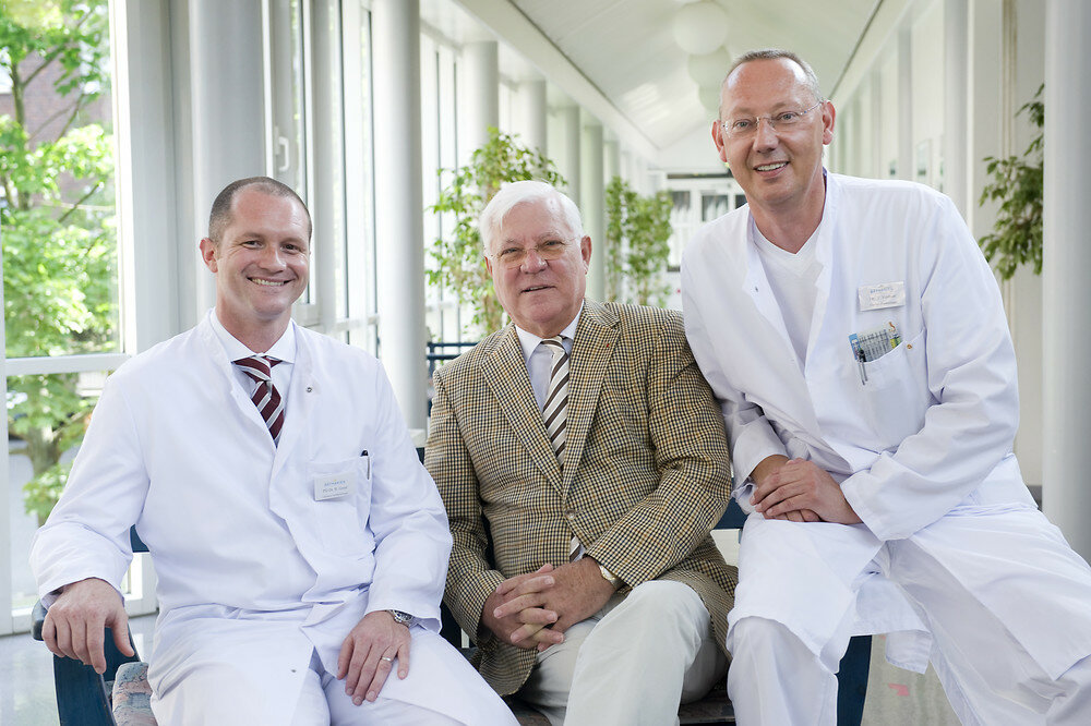Pressefoto: Die Chemie stimmt, wie man sieht: Privatdozent Dr. Bruno Geier (li.) wird als neuer Chefarzt der Gefäßchirurgie von Wilhelm Brunswick als stellvertretendem Vorsitzenden der Bethanien-Krankenhausstiftung (m.) und von Dr. Thomas Voshaar (re.) als ärztlichem Direktor des Krankenhauses begrüßt.