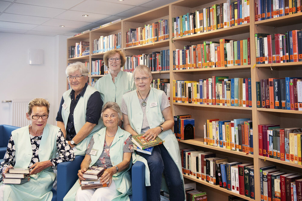 Pressefoto: Sucht noch ehrenamtliche Verstärkung: Das Büchereiteam der Grünen Damen und Herren im Krankenhaus Bethanien mit (v.l.n.r.) Edith Wendeling, Ellen Bours, Ursula Kerp (hinten), Edelgard Nietert (vorn) und Marianne Mrosek.