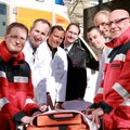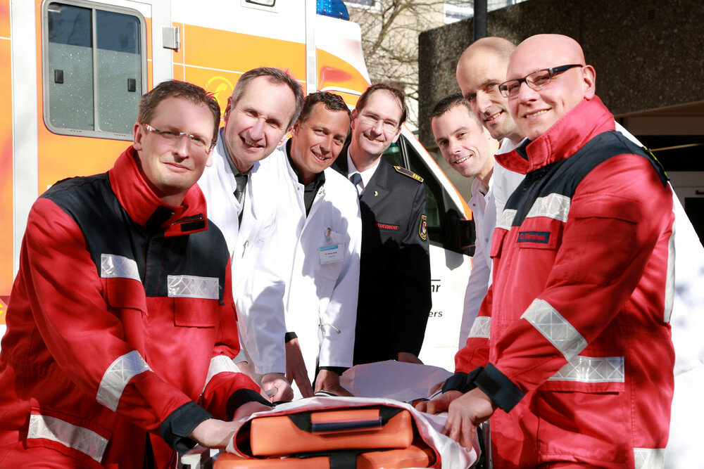 Pressefoto: Gemeinsame Rettungsübung der Feuerwehr mit den beiden Moerser Krankenhäusern (v.l.n.r.): Hauptbrandmeister Thomas van Gelder, Chefarzt Dr. Christoph Chylarecki von der Unfallchirurgie und Orthopädie im Krankenhaus Bethanien, Chefarzt Dr. Rainer Körte von der Zentralen Notaufnahme des St. Josef Krankenhauses, der Moerser Feuerwehrchef Christoph Rudolph, Bethanien-Oberarzt Dr. Karsten Maier, Chefarzt Dr. Michael Jonas von der Orthopädie und Unfallchirurgie St. Josef sowie Oberbrandmeister Orhan Karahan.