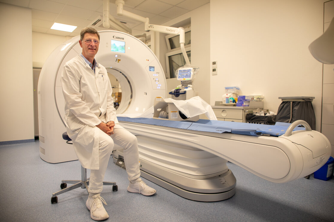 Das neue Gerät in der Radiologie ist ein sogenanntes 320-Zeilen-Volumen-CT, das mit einer Umdrehung einen 16 Zentimeter großen Ausschnitt des untersuchten Bereichs beim Patienten bzw. bei der Patientin darstellt – eine deutliche Verbesserung insbesondere für die Untersuchung von unruhigen Patient:innen, wie Kindern und Dementen. In Kombination mit einem EKG ist sogar die Darstellung des Herzens in seinen kurzen Ruhephasen zwischen den Schlägen möglich. Eine vollständige Herz-CT-Untersuchung dauert gerade einmal 275 Millisekunden, also schneller als das Herz schlägt. Von diesem Gerätetyp sind bundesweit derzeit nur sehr wenige im Einsatz.