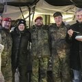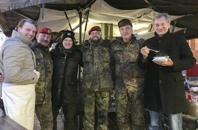 Pressefoto: Einsatz auf dem Moerser Weihnachtsmarkt (v.l.n.r.): Der Moerser Bürgermeister Christoph Fleischhauer, der Vorsitzende der Reservistenkameradschaft Hans-Peter Schichtel, TV-Promi Detlev „Deffi“ Steves, sowie der Stabsunteroffizier Mario Niedwidz und der Gefreite Peter Merker verkauften Gegrilltes und Erbsensuppe zugunsten der von Chefarzt Dr. Michael Wallot (ganz re.) geleiteten Kinderklinik Bethanien