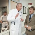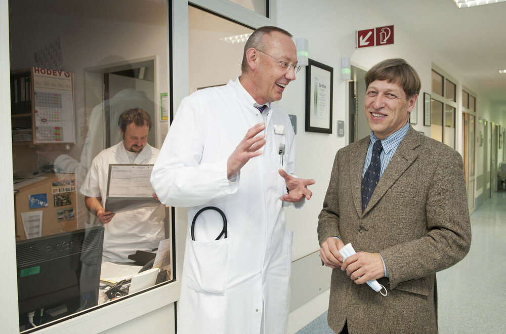 Pressefoto: Keine Verständigungsschwierigkeiten unter Lungenexperten: Mit einem schwer kranken Patienten kam Prof. Wladimir Mezhebovskyi (re.) aus dem russischen Orenburg zu Chefarzt Dr. Thomas Voshaar in die Lungenklinik Bethanien.