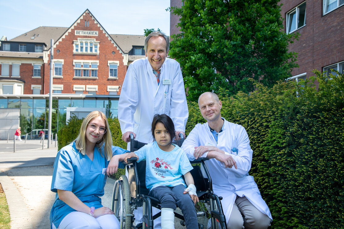 Die Chirurgen versorgten das Mädchen während der im Schnitt anderthalbstündigen Operationen unter anderem mit sogenannten Antibiotikaketten, die sie in den entzündeten Beinknochen legten. Die hochwirksamen Medikamente sollten dafür sorgen, dass die Entzündungsherde abklingen und sich der Knochen wieder beruhigt. Auch nach der Operation musste sie weiterhin Antibiotika einnehmen, damit die gesamte Therapie wirkt. Noch im Sommer war die kleine Patientin einige Male zu Kontrollen im Krankenhaus, wo sie während ihrer gesamten Behandlung ein Team aus Kinderärzt:innen, Pflegekräften und Physiotherapeut:innen betreute. Mit Erfolg: Inzwischen läuft das Mädchen wieder, ohne auf den Rollstuhl oder auf Krücken angewiesen zu sein. In den nächsten Wochen kann sie nach knapp 9 Monaten Aufenthalt in Deutschland die Heimreise antreten und wieder zurück zu ihrer Familie nach Afghanistan.