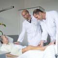 Pressefoto: Chefarzt Prof. Bruno Geier (re.) mit Oberarzt Dr. Harald Freis (li.) bei der Morgenvisite in der Gefäßchirurgie Bethanien.