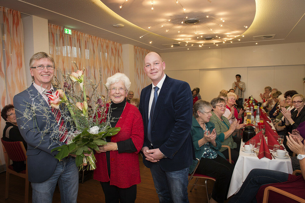 Pressefoto: Dank für vier Jahrzehnte ehrenamtliches Engagement im Seniorenstift Bethanien: Der stellvertretende Heimleiter Volker Erdmann (li.) und Oliver Hering (re.) als Leiter des Sozialen Dienstes dankten Margret Hanner (Mi.) beim Dankeschön-Nachmittag der Ehrenamtler für die von ihr geleistete Arbeit.