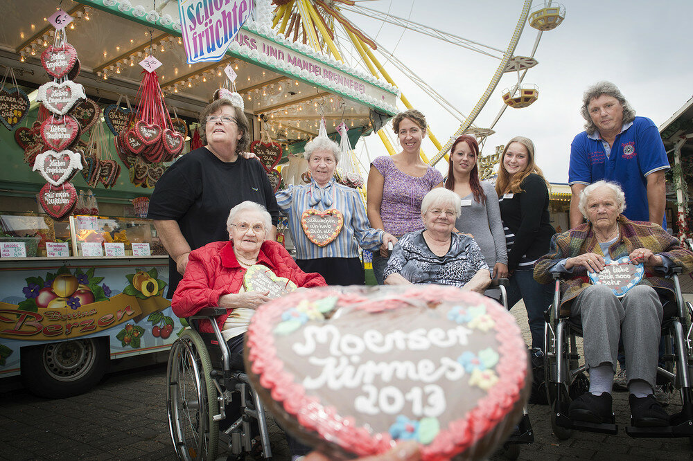 Lebkuchenherzen für alle: Zum Ausklang der Moerser Kirmes stürzten sich auch Seniorinnen des Altenkrankenheims Bethanien ins Getümmel. Gemeinsam mit Pflegekräften und ehrenamtlichen Helfern hatte das Altenkrankenheim den Ausflug am letzten Kirmestag organisiert. Klare Sache, dass dabei der Stand mit den Lebkuchenherzen eine der ersten Anlaufstellen war. Nach einer kleinen Stärkung mit einem Tässchen Kaffee stand ein Rundgang über die Kirmes und eine Fahrt mit dem Riesenrad auf dem Programm. Zur Feier des Tages genehmigten sich die Seniorinnen vor der Heimfahrt dann noch ein Gläschen Bier. "Ein schöner Ausflug, der allen Beteiligten sehr viele Spaß gemacht hat", so Margit Kläckes vom Sozialen Dienst des Altenkrankenheims Bethanien.