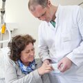 Pressefoto: Chefarzt Dr. Bruno Geier von der Gefäßchirugie des Krankenhauses Bethanien zeigt der Patientin Ute Heinrich aus Moers das kleine Kunststoffstückchen, das bei der Operation um die Vene in der Leistengegend gelegt wird.