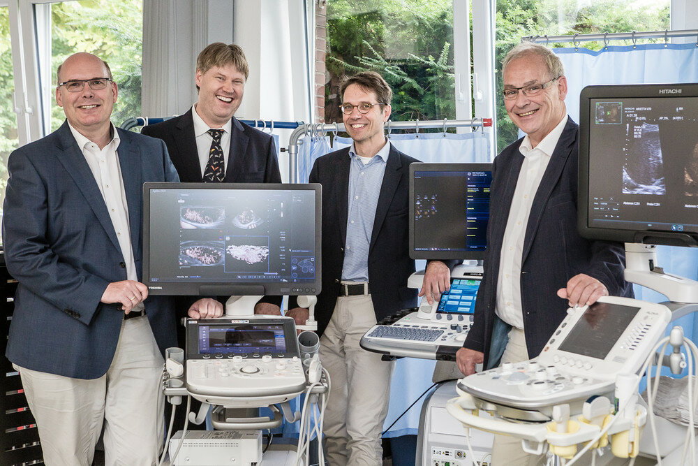 Pressefoto: Experten der Ultraschall-Sonographie: Beim 11. Moers-Weseler Kontrastmittelworkshop waren die Veranstalter von den hervorragenden Bildern der neusten Geräte führender Hersteller überzeugt. Eingeladen zu der Tagung hatten Chefarzt Dr. Christoph Vogt (li.) vom Moerser Krankenhaus St. Josef, Chefarzt Prof. Dr. Ralf Kubitz (2.v.r.) vom Krankenhaus Bethanien sowie der frühere Chefarzt der Medizinischen Klinik II des Marien-Hospitals in Wesel, Dr. Max Brandt (re.). Den Festvortrag hielt Privatdozent Dr. Konrad Stock (2.v.l.) vom Klinikum rechts der Isar in München.