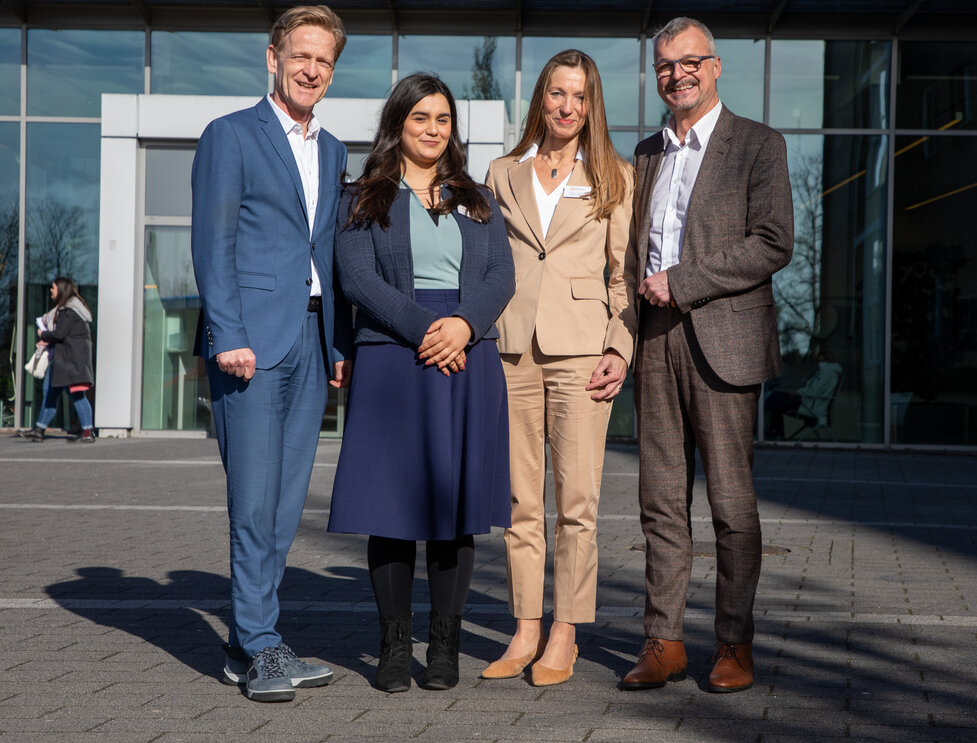 Dr. Ralf Engels (Vorstand der Stiftung Bethanien Moers), Ana-Maria Tepic (Sprachtrainerin der Bethanien Akademie), Andrea Kroekel (Sprachtrainerin der Bethanien Akademie) freuen sich über die Spende der Unternehmensgruppe Maas, die Geschäftsführer Thomas Kuchejda stellvertretend übergab (v. l.).