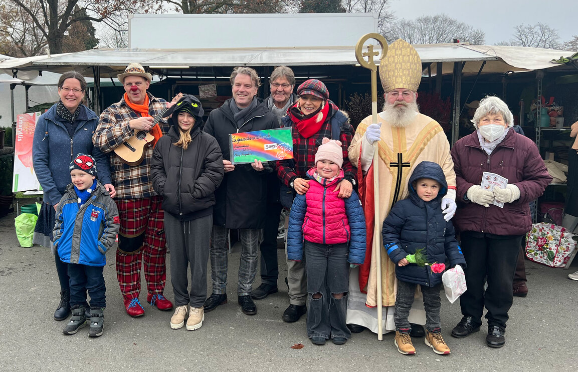 Seit sechs Jahren sammelt Carola Wolter auf dem Wochenmarkt Spenden für die Klinik für Kinder- und Jugendheilkunde im Krankenhaus Bethanien Moers. Jedes Jahr wird so aus vielen kleinen Beträgen eine große Spende. Auch dieses Jahr zählte die Sammelbüchse wieder einmal eine fünfstellige Summe: Genau 3019,50 Euro übergab die Blumenhändlerin jetzt auf dem Meerbecker Wochenmarkt an eine Vertreterin des Krankenhauses Bethanien. Gemeinsam mit Bürgermeister Christoph Fleischhauer, dem Nikolaus, alias Klaus-Dieter Wiederhold, und Clown Slim, alias Dave Luza, machte Carola Wolter nicht nur Oberärztin Andrea Finke eine Freude. Der heilige Nikolaus übergab den anwesenden Kindern Schokolade und Obst – finanziert von Carola Wolter, Jan Maasacker und Bernd Meuskens. Clown Slim versüßte den anwesenden Kindern den Tag mit kleinen Geschenken und spontaner Musik. Mit dem Betrag sollen die im Bethanien tätigen Klinikclowns vom Verein Clownsvisite unterstützt werden, die mit ihren Besuchen den Kindern auf der Station ein Lachen ins Gesicht zaubern. „Im Namen des Teams der Kinderklinik möchte ich mich herzlich für diese Spende bedanken. Es gibt nichts Schöneres als leuchtende Kinderaugen und genau diese zaubern die Klinikclowns immer wieder. Teilen macht doppelt Freude“, so Andrea Finke, Oberärztin der Klinik für Kinder- und Jugendheilkunde.