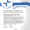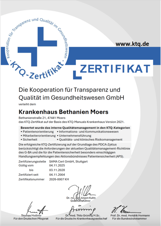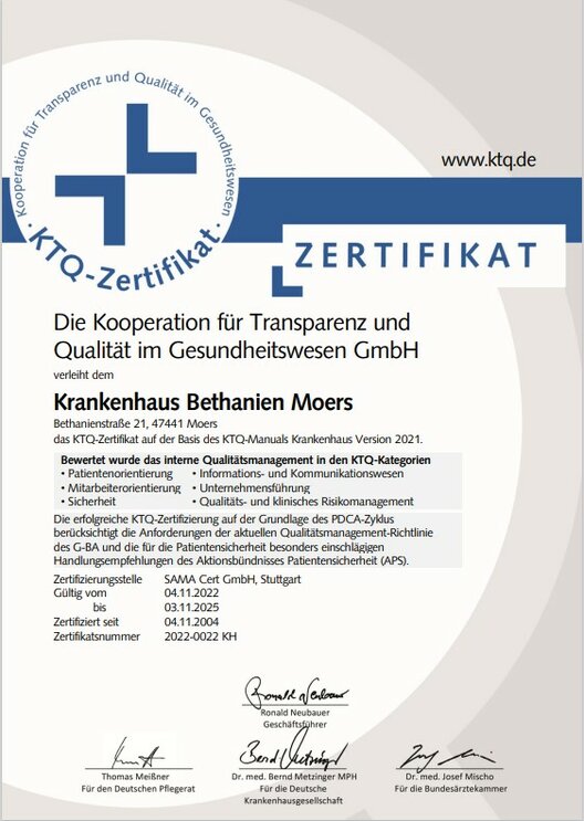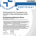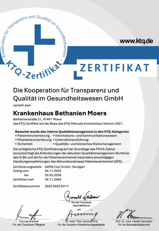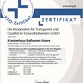 Um die hohe Qualität darstellen zu können, lässt sich das Krankenhaus Bethanien sowohl als Ganzes als auch in einzelnen Bereichen regelmäßig von externen Prüfern begutachten und zertifizieren. Bei diesen Zertifizierungsverfahren erhalten wir - zusätzlich zu bereits erfolgen internen Überprüfungen und Überlegungen - wertvolle Hinweise auf weitere Verbesserungsmöglichkeiten, denn darum geht es beim systematischen Qualitäts- und Risikomanagement in der Hauptsache.